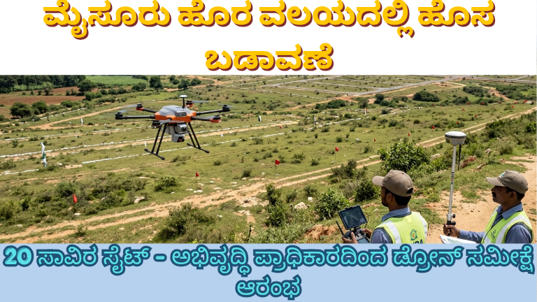 ಮೈಸೂರು ನಗರ ಹೊರವಲಯದಲ್ಲಿ ಭಾರೀ ಮಟ್ಟದ ಹೊಸ ಬಡಾವಣೆ ಅಭಿವೃದ್ಧಿಗೆ ಸರ್ಕಾರ ಮುಂದಾಗಿದೆ. ಸುಮಾರು 20 ಸಾವಿರ ಸೈಟ್ಗಳನ್ನು ಒಳಗೊಂಡಿರುವ ಈ ಯೋಜನೆಗೆ ಆರಂಭಿಕ ಹಂತವಾಗಿ ಡ್ರೋನ್ ಸಮೀಕ್ಷೆ ಕಾರ್ಯ ಆರಂಭಿಸಲಾಗಿದೆ.