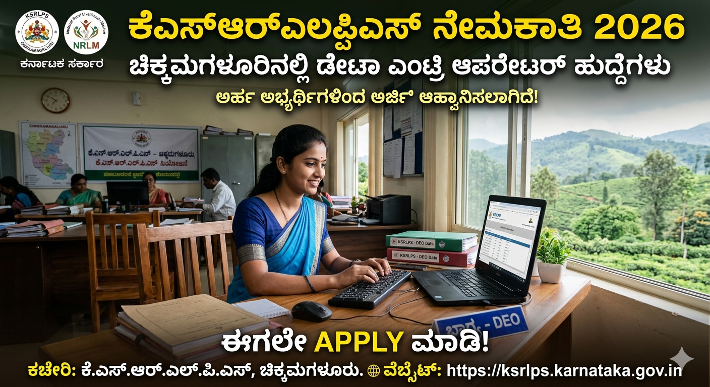 Karnataka State Rural Livelihood Promotion Society (KSRLPS) ವತಿಯಿಂದ ಚಿಕ್ಕಮಗಳೂರು ಜಿಲ್ಲೆಯಲ್ಲಿ ಡೇಟಾ ಎಂಟ್ರಿ ಆಪರೇಟರ್ ಹುದ್ದೆಗಳ ನೇಮಕಾತಿ ಪ್ರಾರಂಭವಾಗಿದೆ.