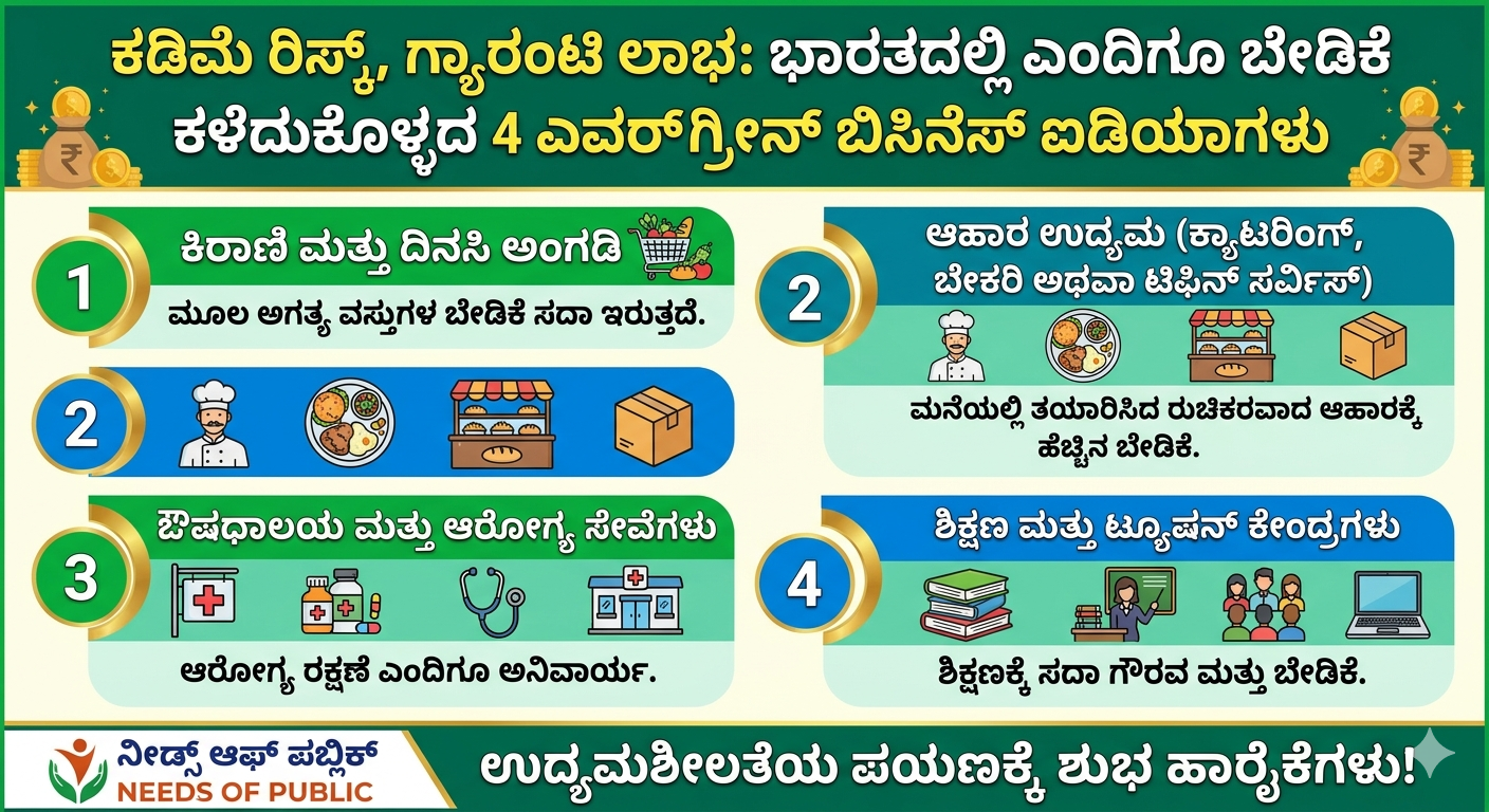 🚀 ಭಾರತದಲ್ಲಿ ಎಂದಿಗೂ ಬೇಡಿಕೆ ಕಡಿಮೆಯಾಗದ 4 ಎವರ್ಗ್ರೀನ್ ಬಿಸಿನೆಸ್ ಐಡಿಯಾಗಳು