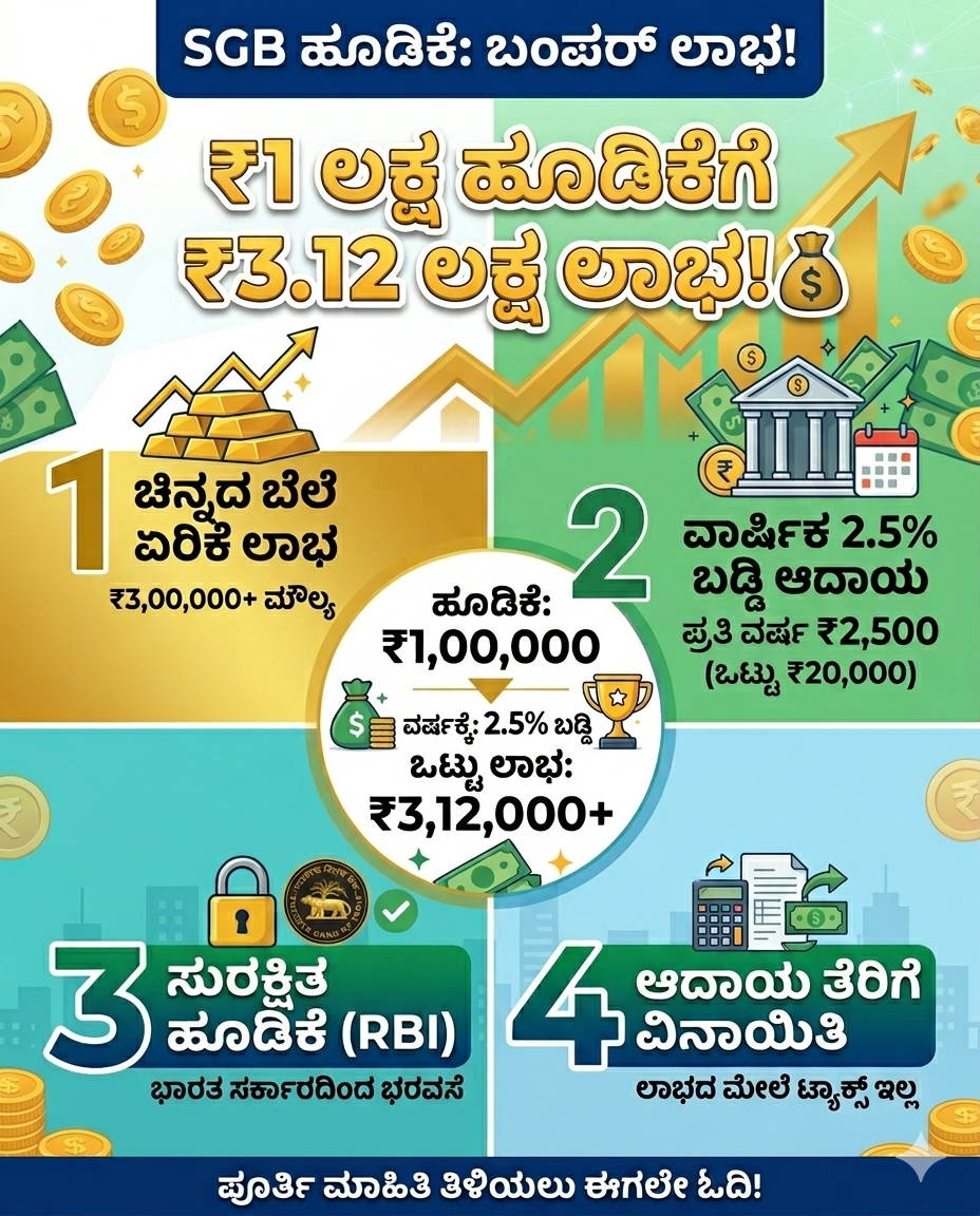 ಇಂತಹ ಸಂದರ್ಭದಲ್ಲಿ ಸರ್ಕಾರ ನೀಡುತ್ತಿರುವ Sovereign Gold Bond (SGB) ಯೋಜನೆ ಹೂಡಿಕೆದಾರರಿಗೆ ಅತ್ಯುತ್ತಮ ಆಯ್ಕೆಯಾಗಿದೆ 💯.